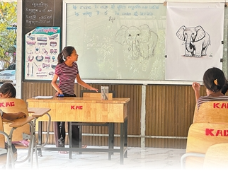 柬埔寨首都金边市郊的儿童艺术福利院内,大龄儿童教年幼伙伴画简笔画大象。