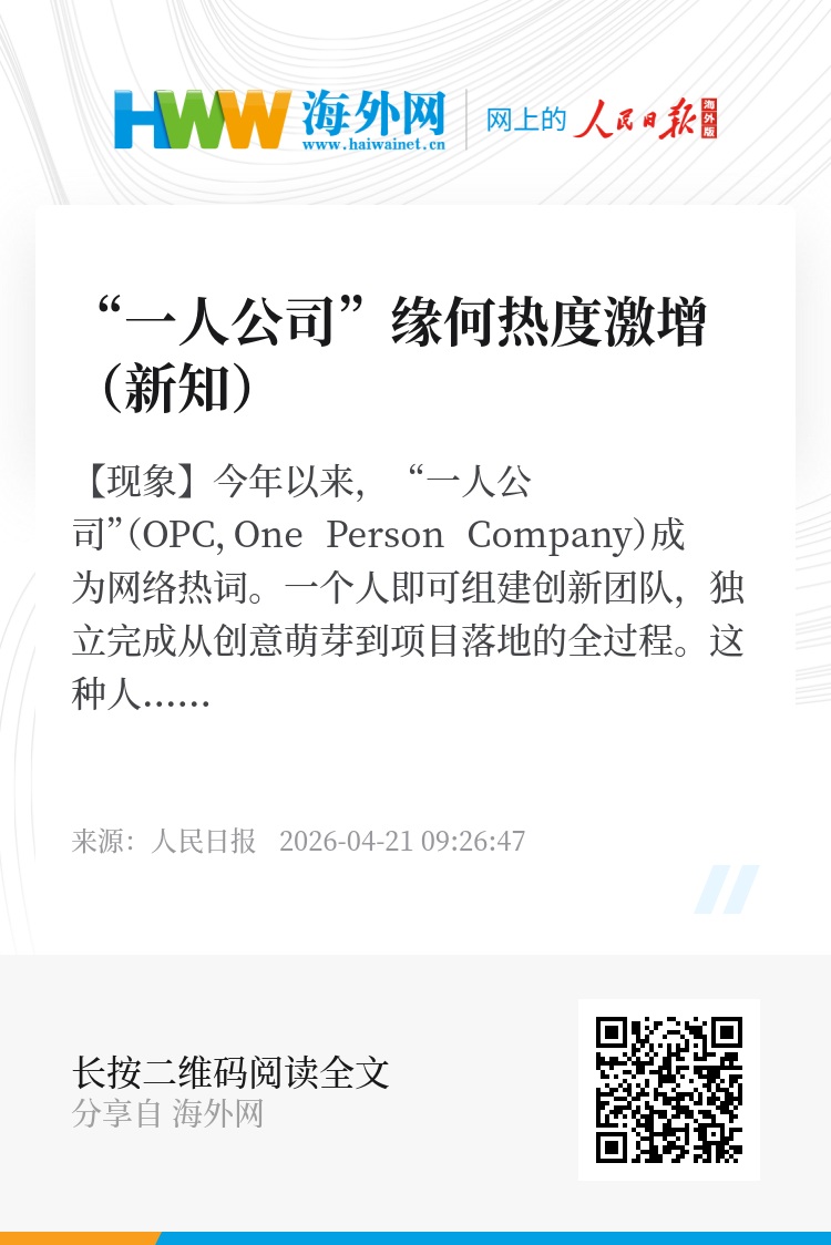 【现象】今年以来,“一人公司”(OPC,One Person Company)成为网络热词。一个人即可组建创新团队,独立完成从创意萌芽到项目落地的全过程。这种人工智能(AI)时代的创业新范式,正在多地加速兴起,吸引越来越多创业者。