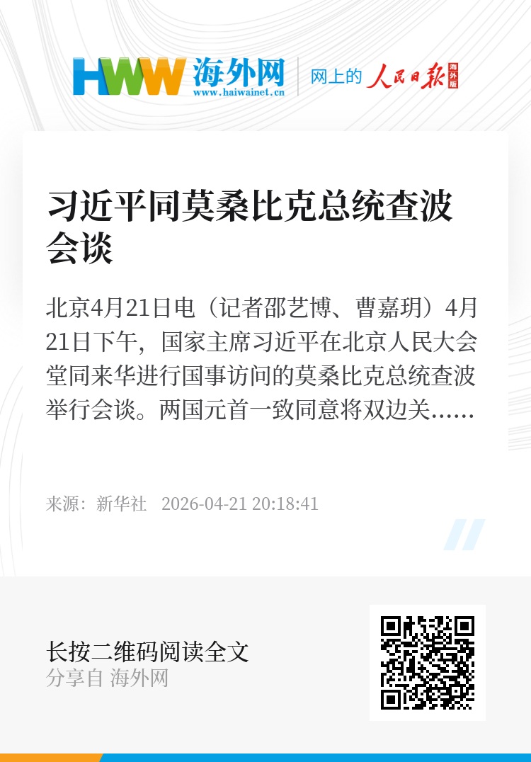 新华社北京4月21日电(记者邵艺博、曹嘉玥)4月21日下午,国家主席习近平在北京人民大会堂同来华进行国事访问的莫桑比克总统查波举行会谈。两国元首一致同意将双边关系提升至新时代中莫命运共同体。