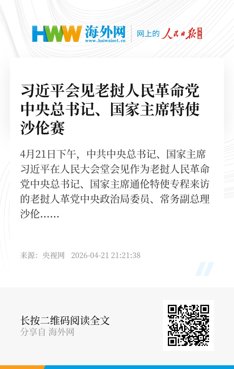 4月21日下午,中共中央总书记、国家主席习近平在人民大会堂会见作为老挝人民革命党中央总书记、国家主席通伦特使专程来访的老挝人革党中央政治局委员、常务副总理沙伦赛。