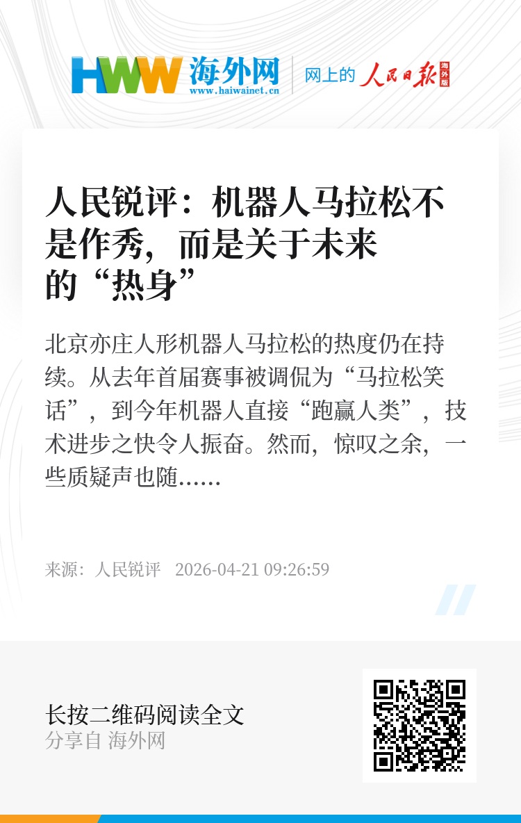 任何一项竞争激烈的运动,往往都需要以跑步作为热身。这场引发广泛关注的机器人马拉松,又何尝不是一次关于未来的“热身”?站上跑道的中国创新者,迎风向前,必将抵达更远的远方,站上新的高度。(常言道)