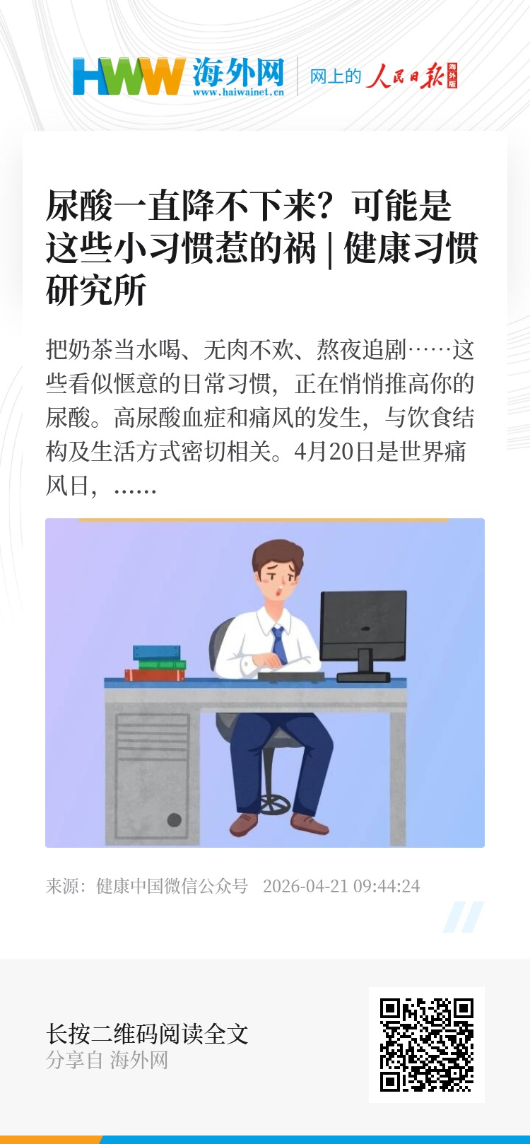 高尿酸血症和痛风的发生,与饮食结构及生活方式密切相关。4月20日是世界痛风日,不妨从改掉一个不经意的小习惯开始。