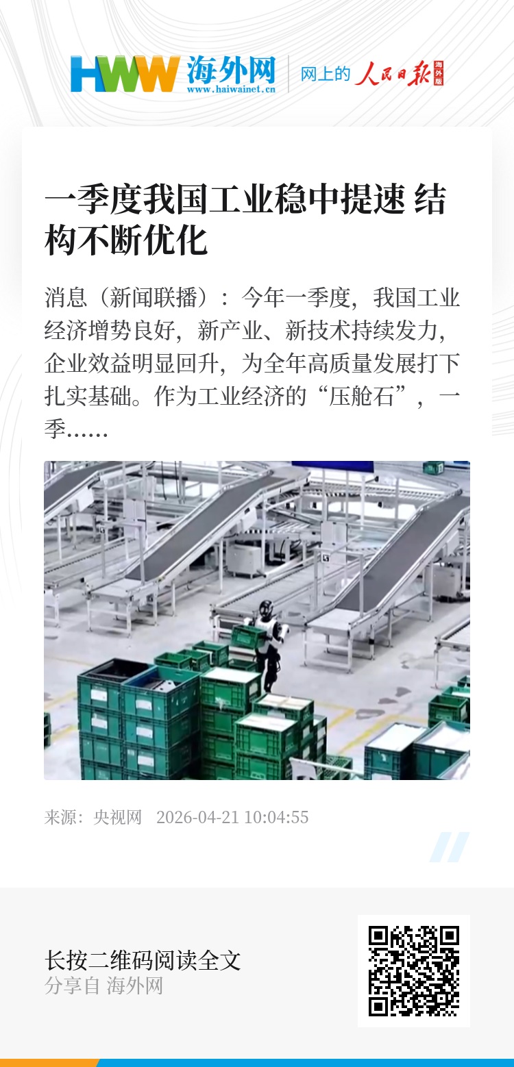 央视网消息(新闻联播):今年一季度,我国工业经济增势良好,新产业、新技术持续发力,企业效益明显回升,为全年高质量发展打下扎实基础。