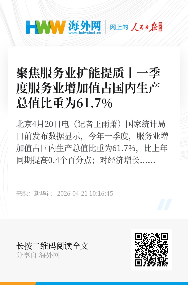 新华社北京4月20日电(记者王雨萧)国家统计局日前发布数据显示,今年一季度,服务业增加值占国内生产总值比重为61.7%,比上年同期提高0.4个百分点;对经济增长的贡献率为63.2%,比上年同期提高4.0个百分点,拉动国内生产总值增长3.2个百分点。