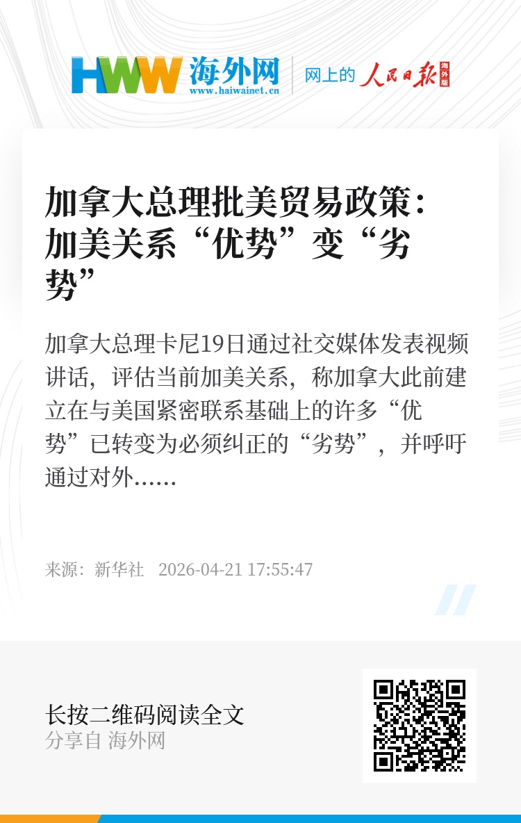 加拿大总理卡尼19日通过社交媒体发表视频讲话,评估当前加美关系,称加拿大此前建立在与美国紧密联系基础上的许多“优势”已转变为必须纠正的“劣势”,并呼吁通过对外贸易多样化应对当前挑战。