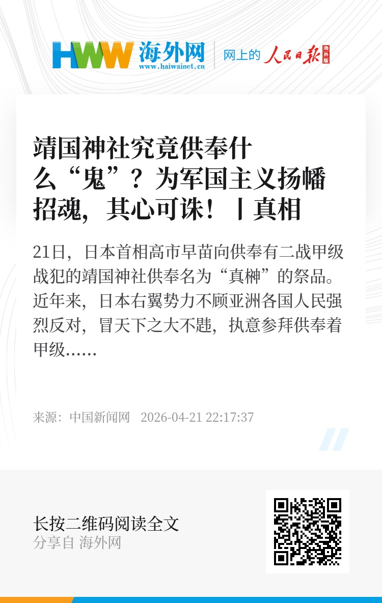 21日,日本首相高市早苗向供奉有二战甲级战犯的靖国神社供奉名为“真榊”的祭品。近年来,日本右翼势力不顾亚洲各国人民强烈反对,冒天下之大不韪,执意参拜供奉着甲级战犯的靖国神社,悍然为军国主义扬幡招魂,其心可诛。