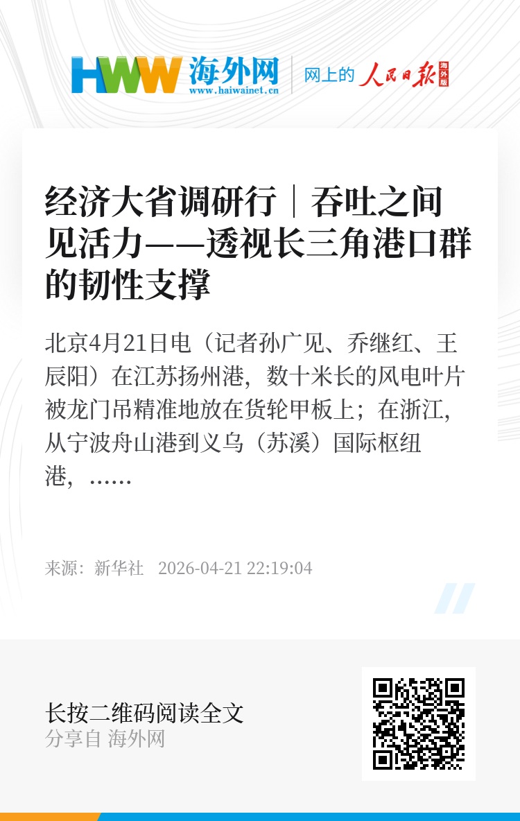 新华社北京4月21日电(记者孙广见、乔继红、王辰阳)在江苏扬州港,数十米长的风电叶片被龙门吊精准地放在货轮甲板上;在浙江,从宁波舟山港到义乌(苏溪)国际枢纽港,一箱箱“中国制造”沿铁轨直通海港,海铁联运无缝衔接;在上海洋山港,远洋巨轮与自动化岸桥在晨光中交织如画,集装箱在智能调度下高效流转,智能屏幕上跳动的吞吐数据,勾勒出我国港口发展的强劲势头……