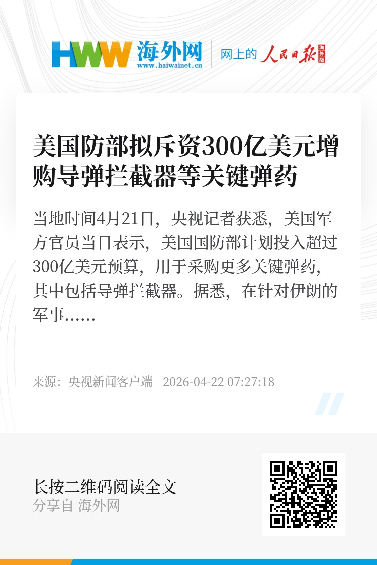 当地时间4月21日,央视记者获悉,美国军方官员当日表示,美国国防部计划投入超过300亿美元预算,用于采购更多关键弹药,其中包括导弹拦截器。