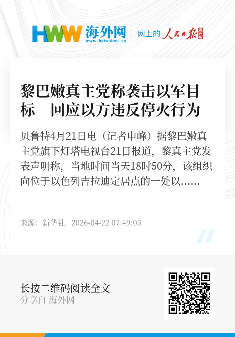 新华社贝鲁特4月21日电(记者申峰)据黎巴嫩真主党旗下灯塔电视台21日报道,黎真主党发表声明称,当地时间当天18时50分,该组织向位于以色列吉拉迪定居点的一处以军炮兵阵地发射火箭弹并出动攻击型无人机实施打击。