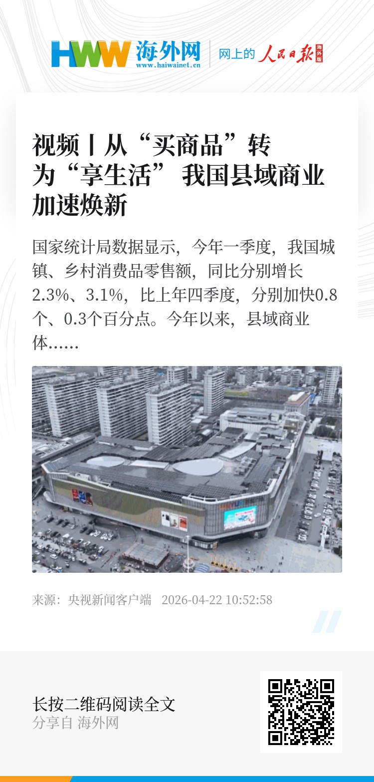 国家统计局数据显示,今年一季度,我国城镇、乡村消费品零售额,同比分别增长2.3%、3.1%,比上年四季度,分别加快0.8个、0.3个百分点。今年以来,县域商业体加快服务消费供给,推动县域消费从“买商品”向“享生活”转变。