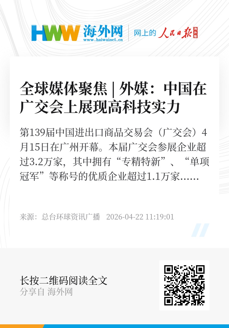 彭博社4月21日的报道称,“战乱震荡全球市场,中国秀出新科技实力”。报道说,作为中国对外开放的重要窗口和国际贸易合作核心平台,今年广交会上一批令人耳目一新的科技公司引人瞩目。