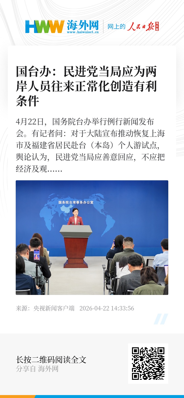 4月22日,国务院台办举行例行新闻发布会。有记者问:对于大陆宣布推动恢复上海市及福建省居民赴台(本岛)个人游试点,舆论认为,民进党当局应善意回应,不应把经济及观光泛政治化。请问对此有何评论?