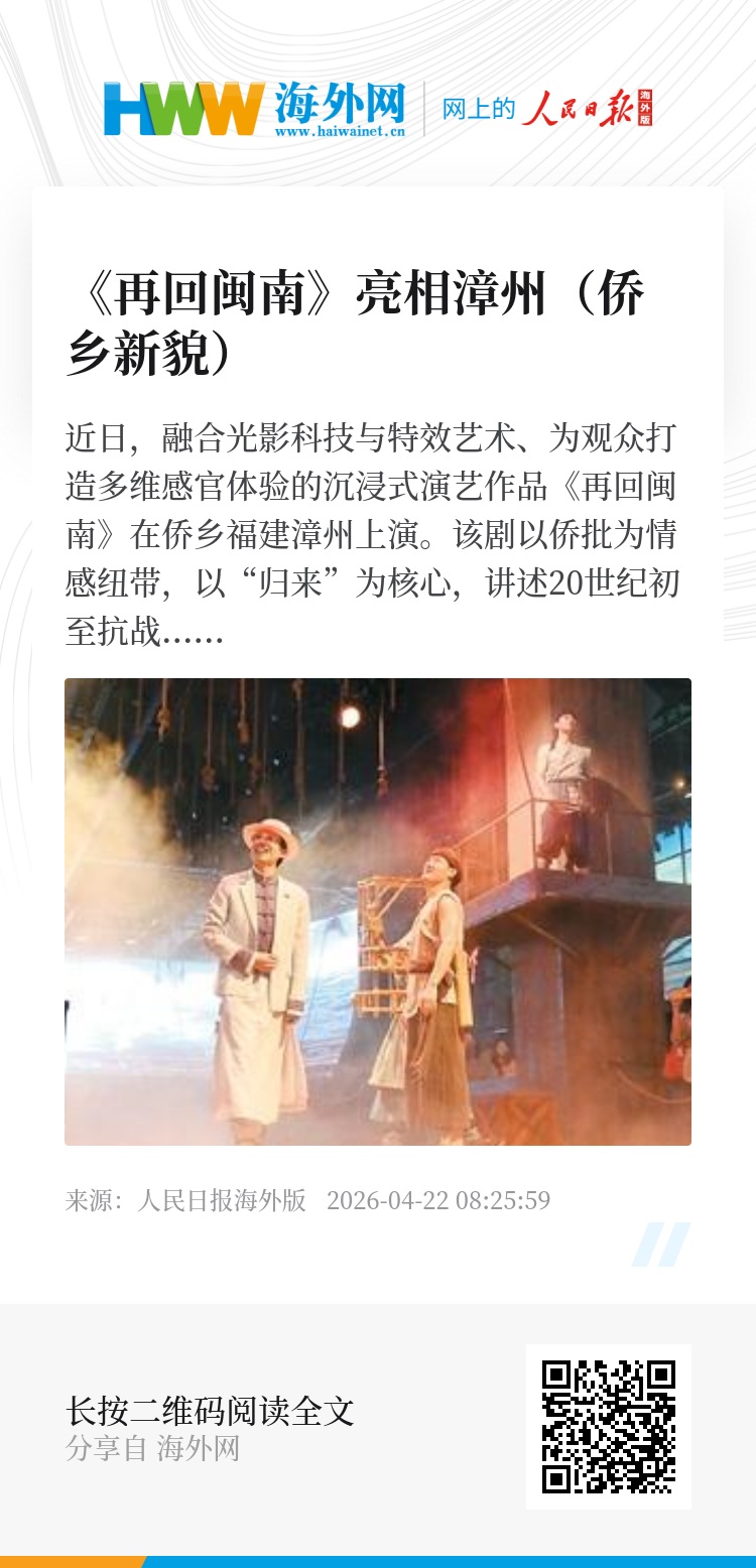 近日,融合光影科技与特效艺术、为观众打造多维感官体验的沉浸式演艺作品《再回闽南》在侨乡福建漳州上演。该剧以侨批为情感纽带,以“归来”为核心,讲述20世纪初至抗战时期漳州人下南洋拼搏与归来的家国故事。图为演员在《再回闽南》现场演出。