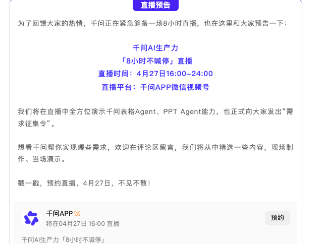 回应之外,千问还做了一个更直接的举动:紧急筹备一场8小时直播,下周一上线,全面演示包括PPT生成在内的office功能,根据用户提的需求,现场制作、当场演示。