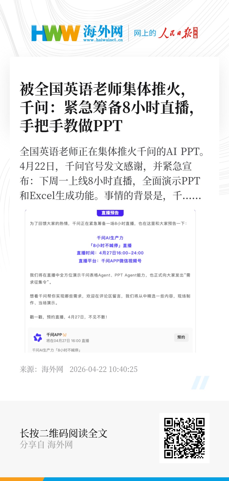 全国英语老师正在集体推火千问的AI PPT。4月22日,千问官号发文感谢,并紧急宣布:下周一上线8小时直播,全面演示PPT和Excel生成功能。