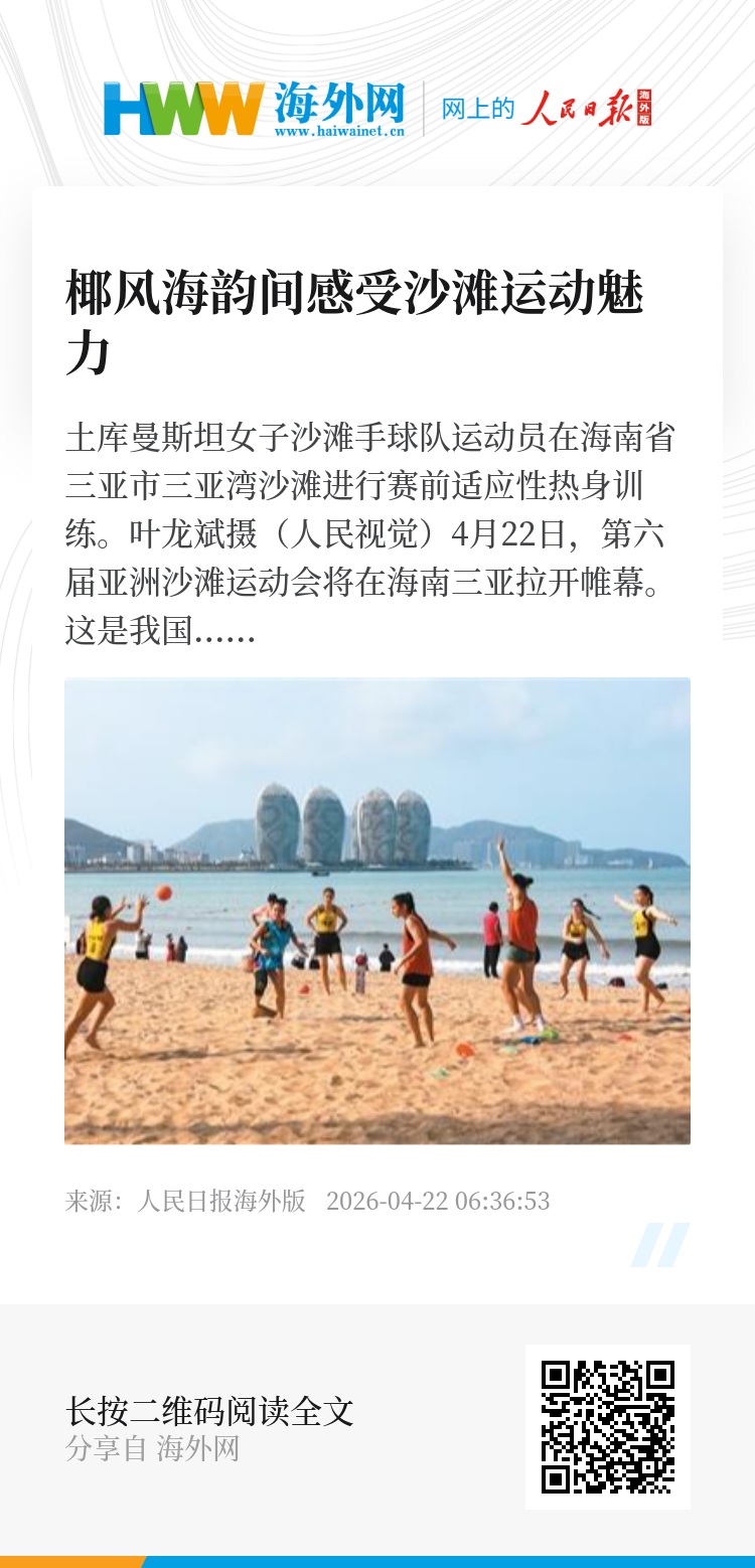 4月22日,第六届亚洲沙滩运动会将在海南三亚拉开帷幕。这是我国继2012年山东海阳亚沙会后,再次承办这一亚洲综合性沙滩体育盛会,也是海南自贸港封关运作后迎来的首个国际大型综合性体育赛事。