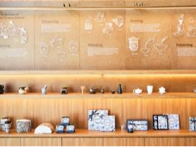 霸王茶姬北美首店里展示的饮茶文化和茶器等。