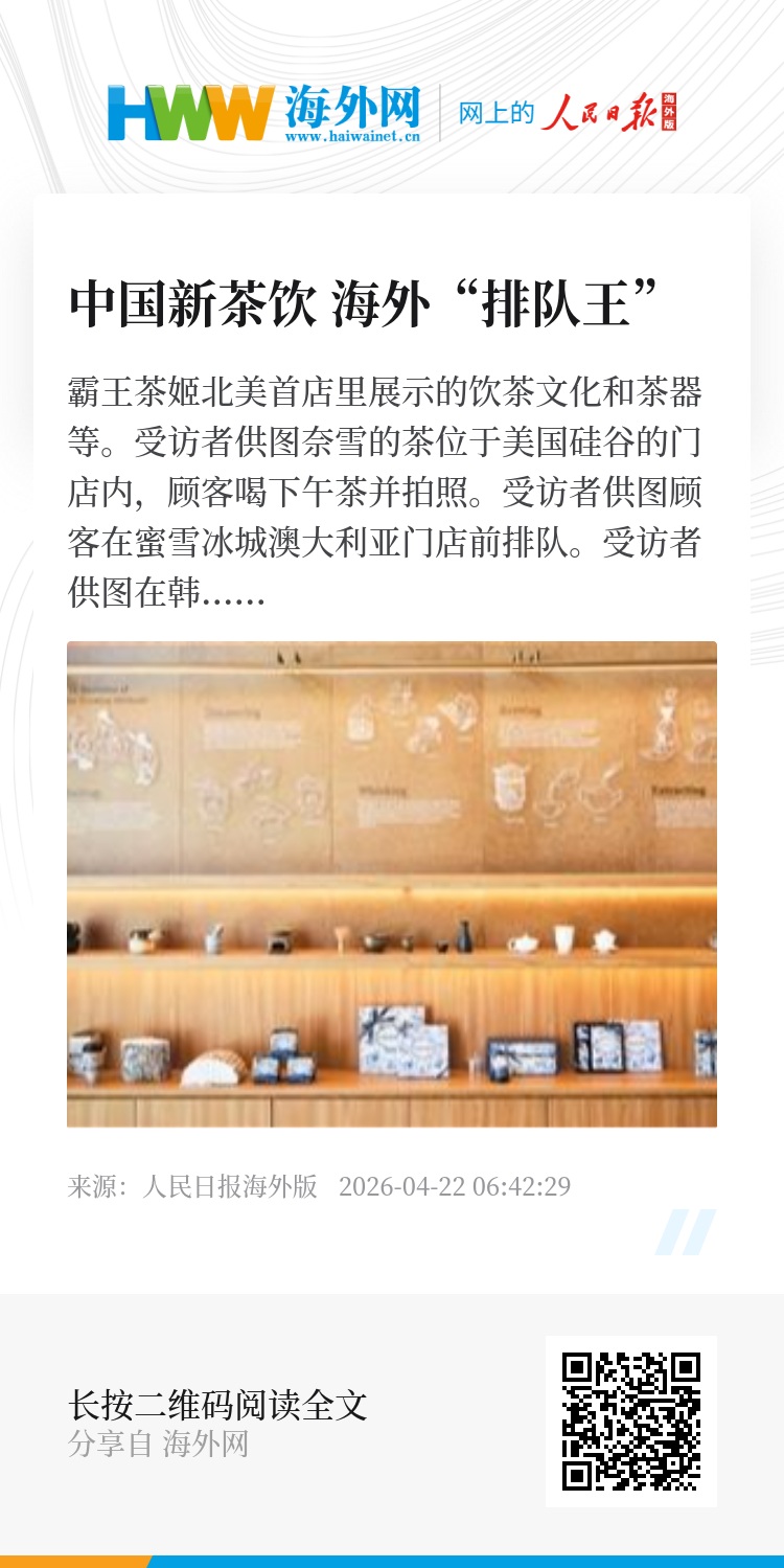 今年4月,中国连锁经营协会发布了“2026中国餐饮/新茶饮出海品牌50榜单”。榜单显示,蜜雪冰城海外门店数量超过4000家,霸王茶姬海外门店超过200家,喜茶、茶百道、奈雪的茶、茶话弄、茉莉奶白等品牌也开设了若干海外门店。许多消费者在这些海外门店前排队数小时,只为一品“东方味道”,中国新茶饮已成为名副其实的“排队王”。