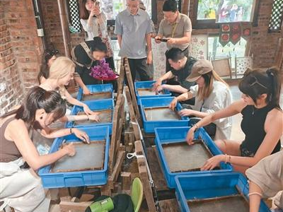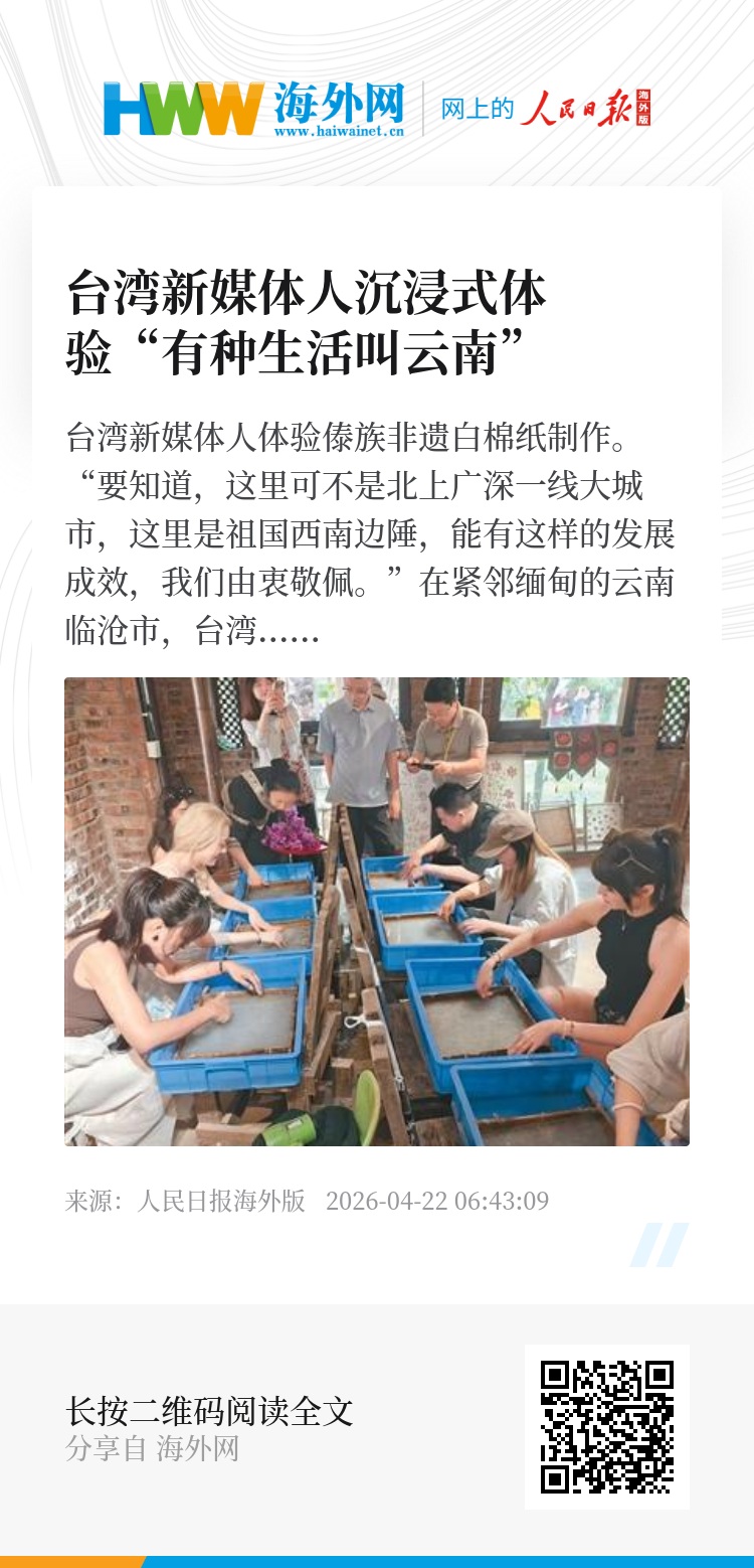在耿马傣族佤族自治县孟定镇南汀画院,台湾新媒体人亲手体验白棉纸制作。该技艺是被誉为“中国古代造纸术活化石”的国家级非遗。造纸工艺完整保留了“浸泡、蒸发、捣浆、浇纸、晒纸”5步流程和11道工序,造出的纸坚韧洁白、防腐防蛀,过去多作为寺庙抄写经文之用,现在则用于民间手工艺品加工和书法、茶叶包装等,传统产业历久弥新。