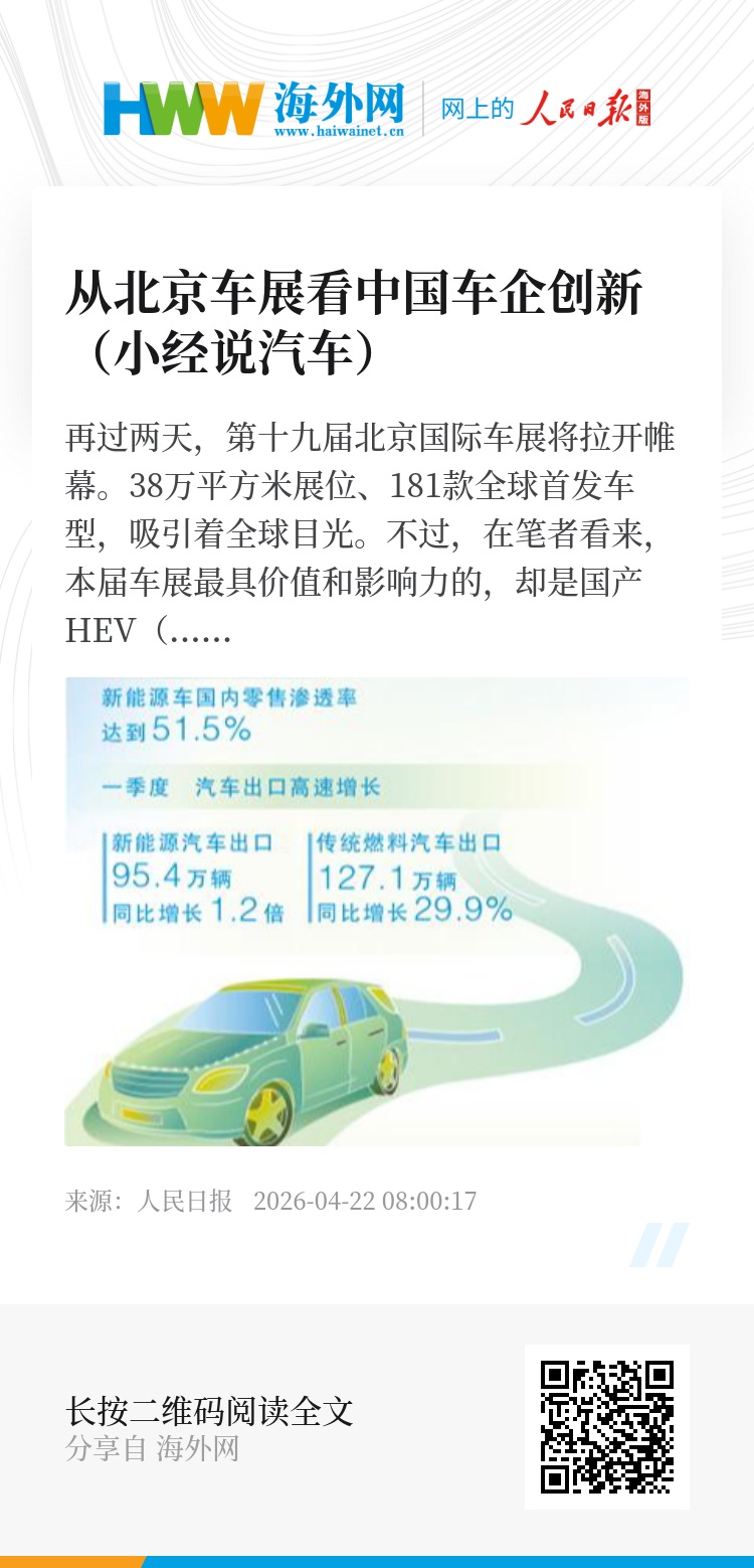 再过两天,第十九届北京国际车展将拉开帷幕。38万平方米展位、181款全球首发车型,吸引着全球目光。不过,在笔者看来,本届车展最具价值和影响力的,却是国产HEV(油电混合动力)技术的群体突破。在吉利、奇瑞、长安展台,你不仅能亲身感受到国产HEV节能减排、智能电感的非凡体验,更会为中国车企创新的又一重大成果倍感自豪。