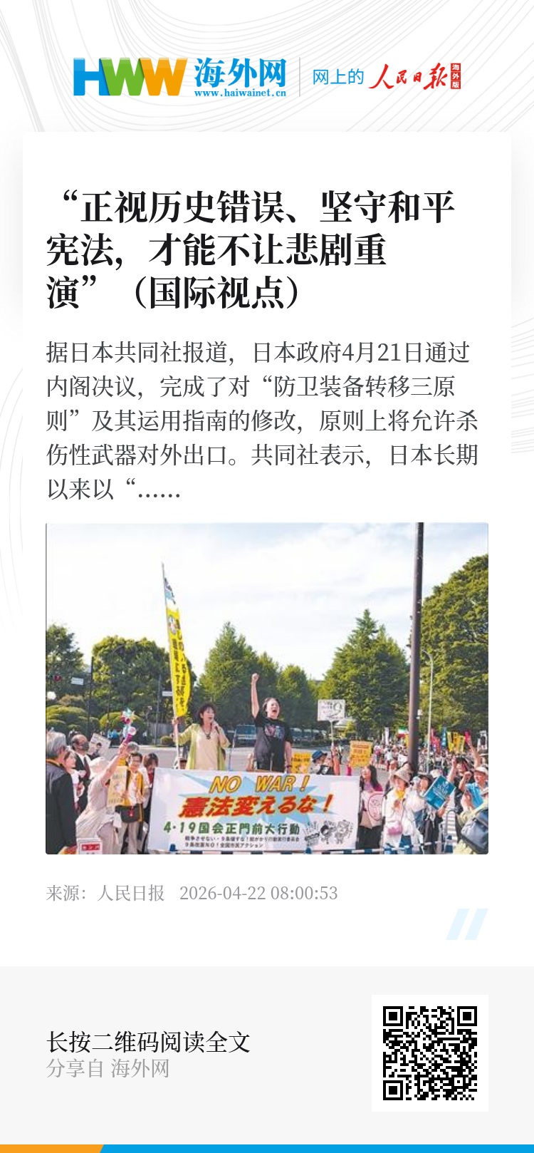 据日本共同社报道,日本政府4月21日通过内阁决议,完成了对“防卫装备转移三原则”及其运用指南的修改,原则上将允许杀伤性武器对外出口。共同社表示,日本长期以来以“和平国家”为定位,此次修订是日本安全保障政策的重大转折。同一天,日本首相高市早苗以“内阁总理大臣”名义,向供奉二战甲级战犯的靖国神社供奉名为“真榊”的祭品。近一段时间,日本右翼势力一系列“再军事化”动作和野心,在日本国内持续引发民众大规模抗议,也引发国际社会强烈反对。各界人士纷纷呼吁日本政府正视历史错误,坚守和平宪法,不要在错误的道路上越走越远。