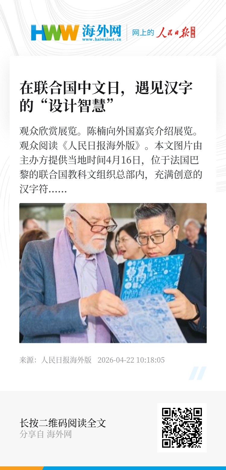 展览传递的思想也影响着汉语教学。作为展览特邀策展人,法国著名汉学家白乐桑基于汉字的表意特点及内涵,长期在对外汉语教学中坚持“字本位”理念。不久前,他还在巴黎中国文化中心举办了“中国文字及其诗性功能”讲座,用街头巷尾的汉字设计案例向法国公众介绍汉字的独特魅力。“中国文字具有其他文字无法企及的‘诗性’,这种特性是中文独有的。”白乐桑说。在他看来,这次展览将这种诗性与智慧直观、集中地放大了。