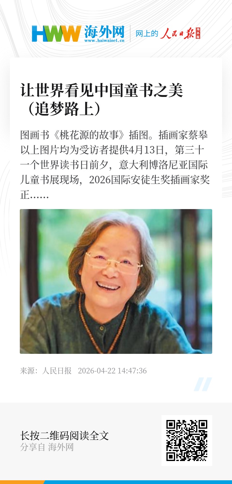 4月13日,第三十一个世界读书日前夕,意大利博洛尼亚国际儿童书展现场,2026国际安徒生奖插画家奖正式揭晓。“蔡皋!”大屏上出现的获奖者姓名和照片,引发在场童书从业者的热烈欢呼。