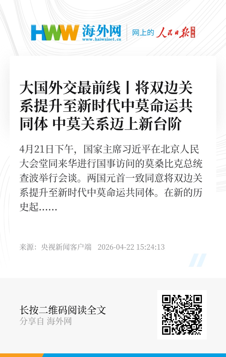 4月21日下午,国家主席习近平在北京人民大会堂同来华进行国事访问的莫桑比克总统查波举行会谈。两国元首一致同意将双边关系提升至新时代中莫命运共同体。
