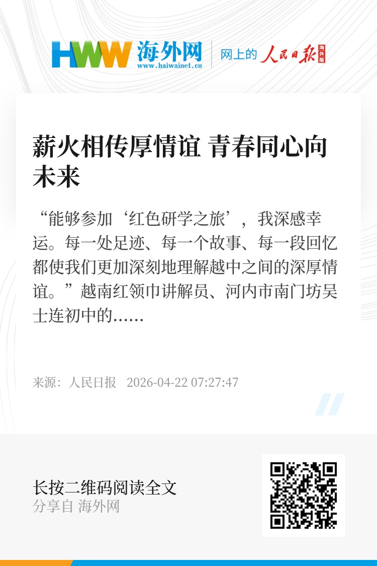 越南荣市大学学生阮明幸说:“我更加清楚地认识到,在历史的每一个重要关头,青年一代始终对国家命运肩负着重要责任。对于两国青年而言,这份责任还与维护和发展两国友谊息息相关。今天青年一代间的相互理解、尊重与合作,是未来合作的重要基础。”