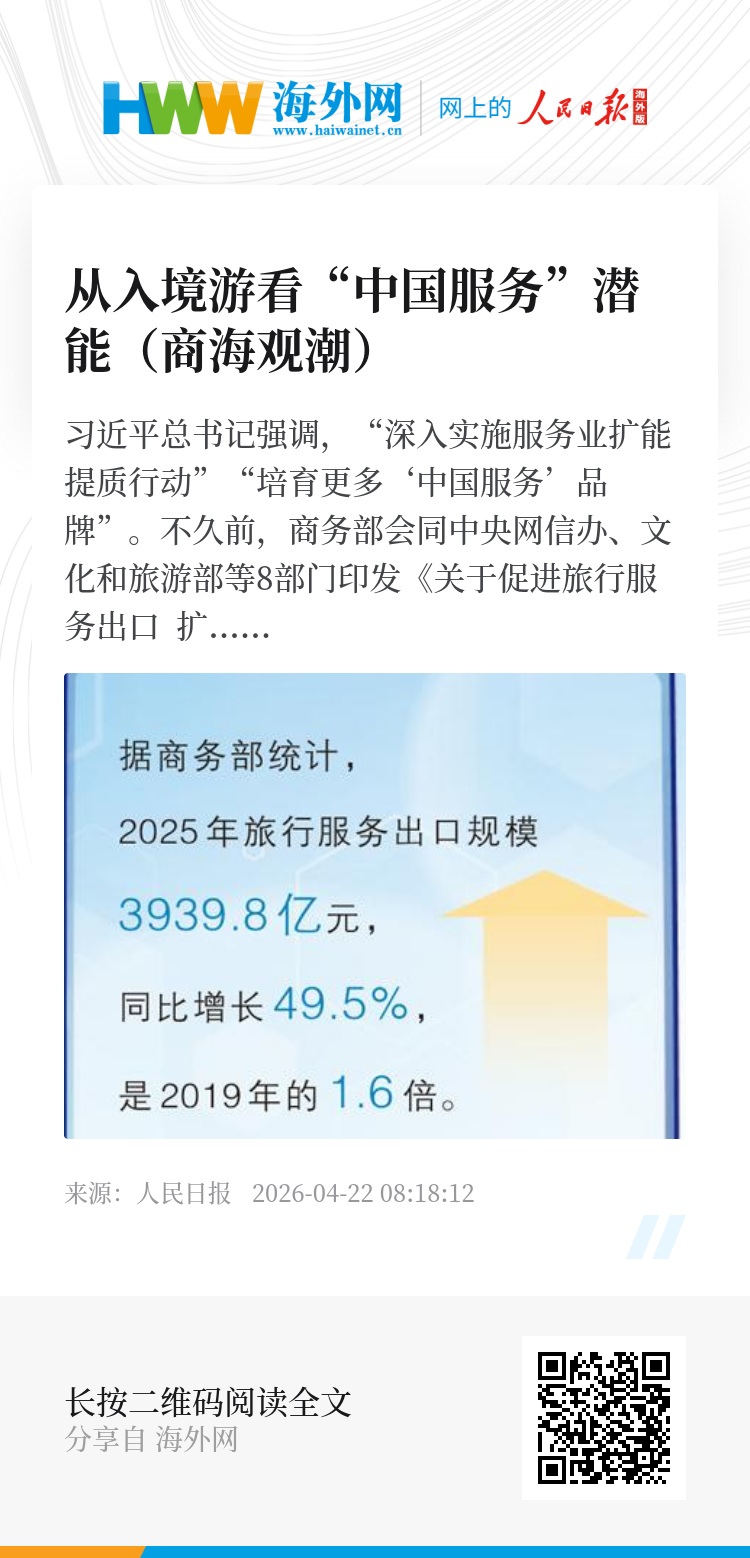 旅行服务是我国服务贸易第一大领域,进出口规模占服务贸易总额的比重超过1/4,入境游是观察“中国服务”的一扇窗口。近年来,我国持续推进签证便利化、支付国际化、服务标准化等一系列举措,入境旅游和消费吸引力迅速提升。国家统计局数据显示,2025年,全国入境外国游客3517万人次,比2024年增长30.5%。入境游客在华“吃住行游购娱”等各类消费计入我国旅行服务出口,据商务部统计,2025年出口规模3939.8亿元,同比增长49.5%,是2019年的1.6倍。从观光打卡到深度体验,从文旅消费到文化共鸣,“中国游”“中国购”风靡全球,既让世界读懂中华文化的独特魅力,更以开放包容的姿态,向全球展现了“中国服务”的诚意与实力。