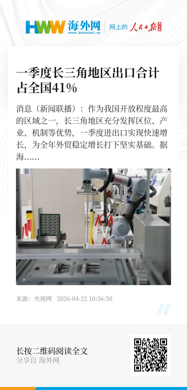 据海关统计,今年一季度,长三角地区进出口总值达4.49万亿元,规模创历史新高,同比增长15.8%,占全国进出口总值的比重提升至37.9%,外贸“压舱石”的地位进一步巩固。其中,出口合计2.81万亿元,占全国出口总额的41%。长三角地区出口结构持续优化,出口机电产品1.78万亿元,同比增长19.7%。其中,“新三样”产品、电脑零部件、工业机器人等智能装备出口均实现大幅增长。
