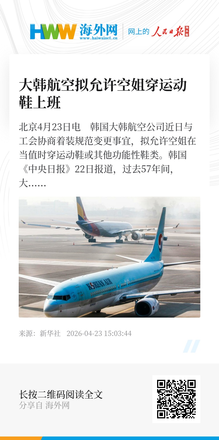 新华社北京4月23日电 韩国大韩航空公司近日与工会协商着装规范变更事宜,拟允许空姐在当值时穿运动鞋或其他功能性鞋类。