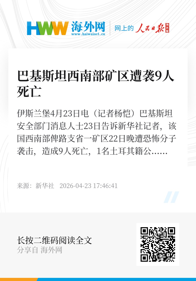 新华社伊斯兰堡4月23日电(记者杨恺)巴基斯坦安全部门消息人士23日告诉新华社记者,该国西南部俾路支省一矿区22日晚遭恐怖分子袭击,造成9人死亡,1名土耳其籍公民被绑架。