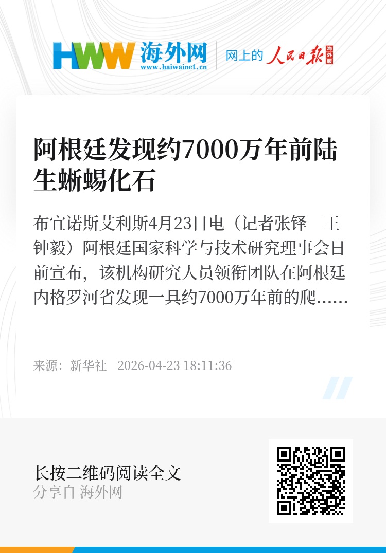 新华社布宜诺斯艾利斯4月23日电(记者张铎 王钟毅)阿根廷国家科学与技术研究理事会日前宣布,该机构研究人员领衔团队在阿根廷内格罗河省发现一具约7000万年前的爬行动物化石,根据下颌骨和颅骨等结构特征将其归入蜥蜴目。