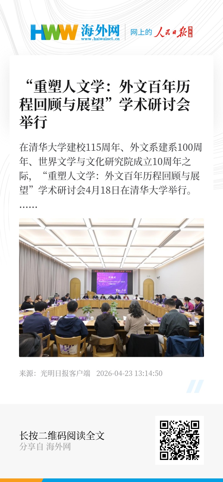 在清华大学建校115周年、外文系建系100周年、世界文学与文化研究院成立10周年之际,“重塑人文学:外文百年历程回顾与展望”学术研讨会4月18日在清华大学举行。来自清华大学、北京大学、北京外国语大学、上海外国语大学、复旦大学、上海交通大学、南京大学、武汉大学、浙江大学、南开大学等高校的学者齐聚一堂,共同回瞰百年来路、近观十年创新,探讨未来发展。