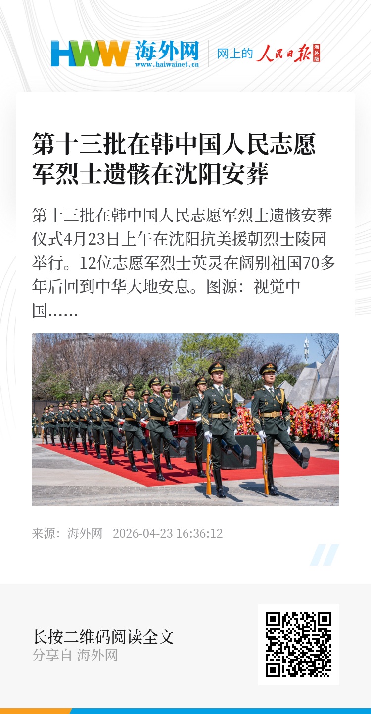 32947806,.第十三批在韩中国人民志愿军烈士遗骸在沈阳安葬,.2026-04-23 16:36:12,.204589,.黄之安、侯兴川