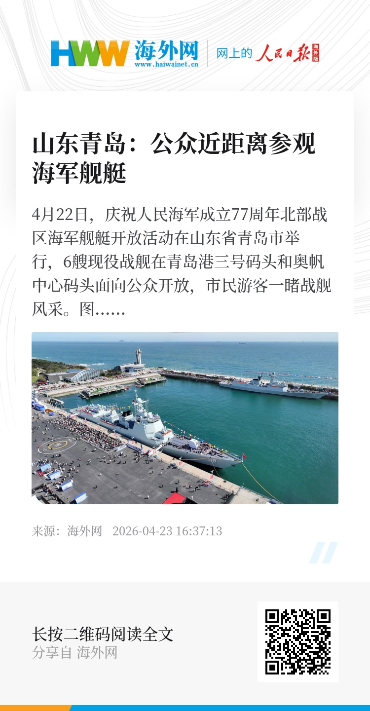 4月22日,庆祝人民海军成立77周年北部战区海军舰艇开放活动在山东省青岛市举行,6艘现役战舰在青岛港三号码头和奥帆中心码头面向公众开放,市民游客一睹战舰风采。图源:视觉中国