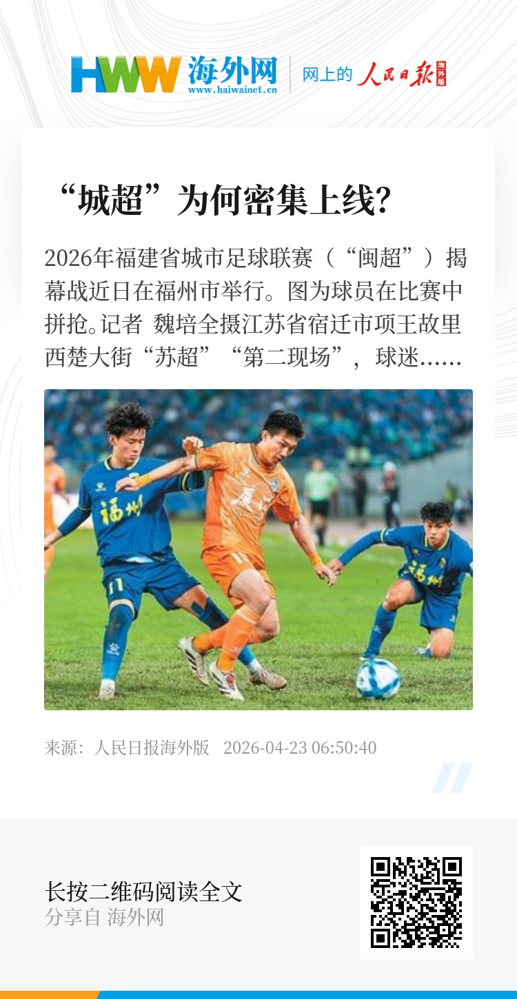 4月19日晚,在5万多名观众的呐喊中,“闽超”打响揭幕战,创下福建省单场赛事观赛人数纪录;同一天,“楚超”首轮战罢,8场比赛29粒进球酣畅淋漓;“苏超”最近重燃战火,热度依旧……一场场接地气的城市足球联赛席卷大江南北。未来几天,“粤超”“宁超”“赣超”等赛事将陆续亮相,东北地区、湖南等地的“城超”也蓄势待发,将于五、六月间启幕。