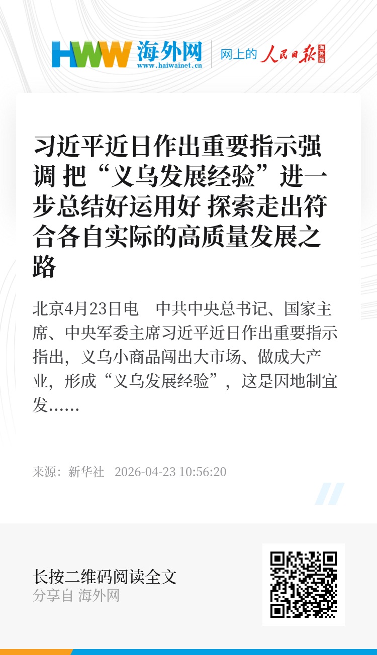 新华社北京4月23日电 中共中央总书记、国家主席、中央军委主席习近平近日作出重要指示指出,义乌小商品闯出大市场、做成大产业,形成“义乌发展经验”,这是因地制宜发展县域经济的成功实践。