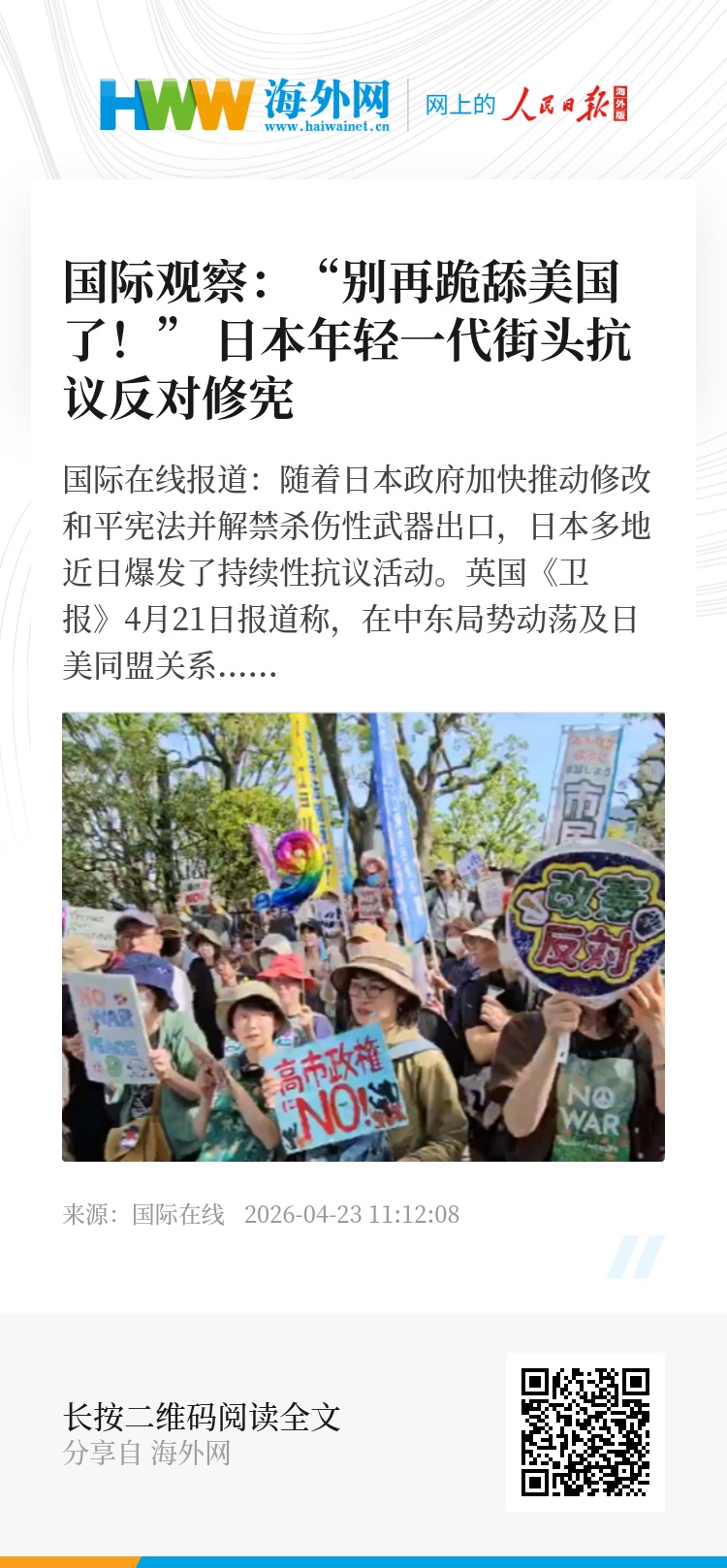 不过,修宪程序门槛较高,需在日本国会两院获得三分之二支持及公投半数同意。从当前政治格局来看,尽管执政的自民党掌握优势,但修宪仍面临程序与民意的双重考验。近期的抗议活动团结了日本不同世代的民众,日本共同社基于手机定位数据分析,在4月8日东京举行的一场集会中,30岁左右人群占比最高,20岁左右群体超两成;在性别方面,女性参与者约占60%。东京上智大学政治学教授中野浩一对《卫报》表示,美以对伊战争和特朗普反复无常的行为模式促使年轻的日本人公开表达自己的观点。“中东战争让人们意识到,在高市领导下,日本可能会卷入一场非法战争……因此,更多的人感到他们有必要表明对宪法第九条的支持,因为这是抵御战争的最后一道防线。”(胡晓薇)