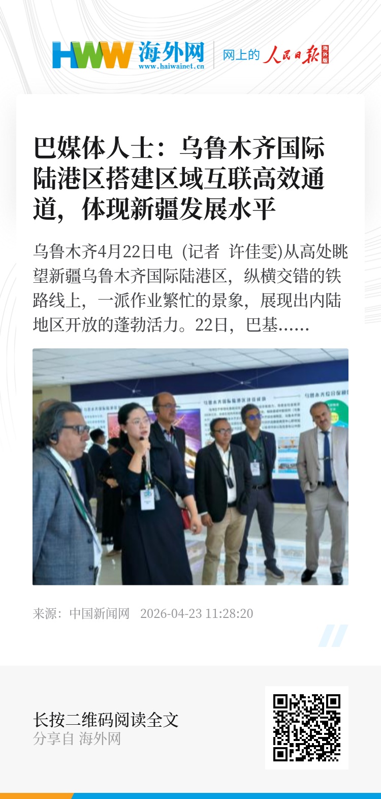 接受中新网采访时,巴基斯坦国家海洋事务研究所(NIMA)主席贾维德·伊克巴尔表示,乌鲁木齐国际陆港作为重要物流枢纽,为中国与中亚及欧洲之间提供了高效贸易通道,有助于提升区域贸易便利化水平。