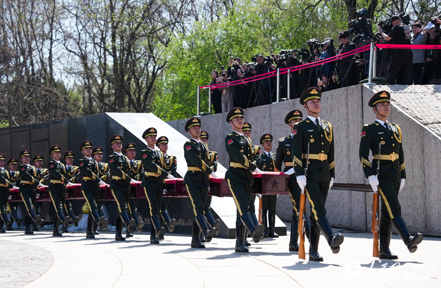 苍松垂泪,翠柏含悲。《思念曲》再次奏响,礼兵们抬起志愿军烈士棺椁绕广场半周,缓缓走向安葬地宫。全场人员肃立凝视着烈士棺椁,默默地排起长队礼送,依次向烈士献花致敬,并瞻仰烈士英名墙。截至目前,共有1023位在韩中国人民志愿军烈士在这里安息。