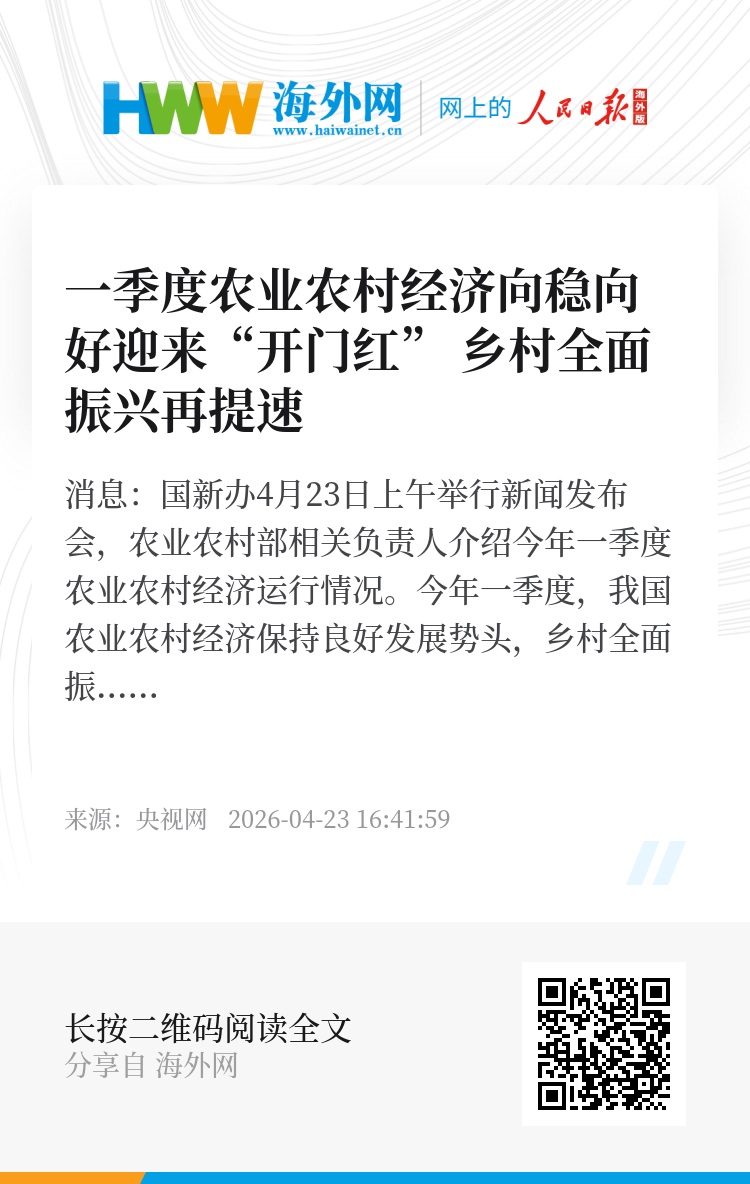 央视网消息:国新办4月23日上午举行新闻发布会,农业农村部相关负责人介绍今年一季度农业农村经济运行情况。今年一季度,我国农业农村经济保持良好发展势头,乡村全面振兴扎实推进。