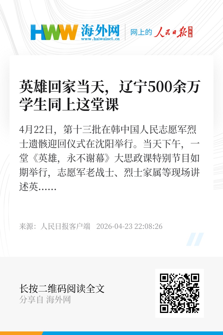 4月22日,第十三批在韩中国人民志愿军烈士遗骸迎回仪式在沈阳举行。当天下午,一堂《英雄,永不谢幕》大思政课特别节目如期举行,志愿军老战士、烈士家属等现场讲述英雄故事,辽宁全省500余万大中小学生一同聆听、学习、传承……