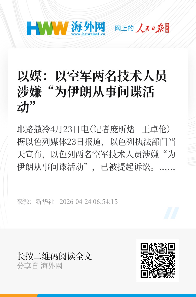新华社耶路撒冷4月23日电(记者庞昕熠 王卓伦)据以色列媒体23日报道,以色列执法部门当天宣布,以色列两名空军技术人员涉嫌“为伊朗从事间谍活动”,已被提起诉讼。