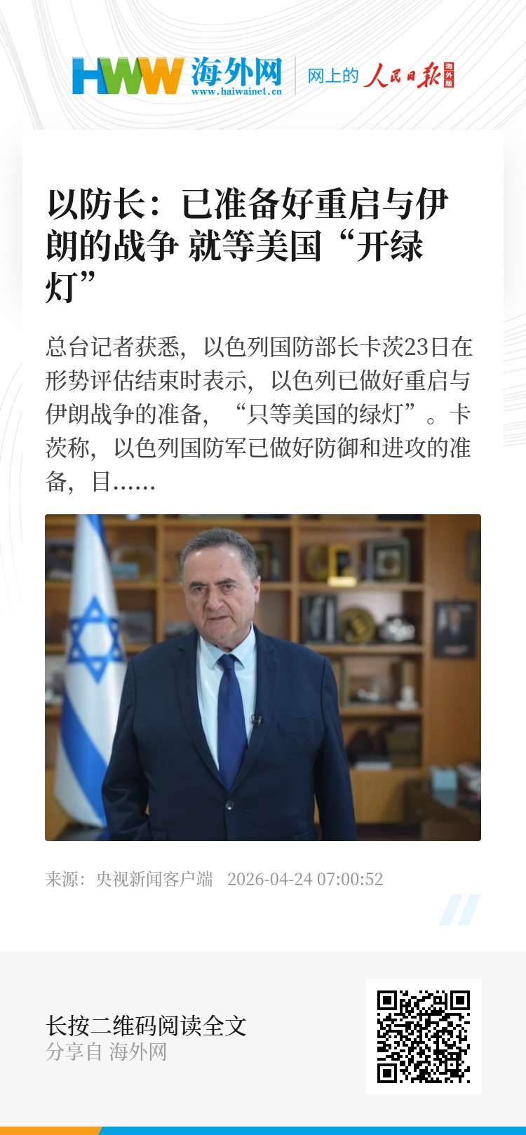 总台记者获悉,以色列国防部长卡茨23日在形势评估结束时表示,以色列已做好重启与伊朗战争的准备,“只等美国的绿灯”。