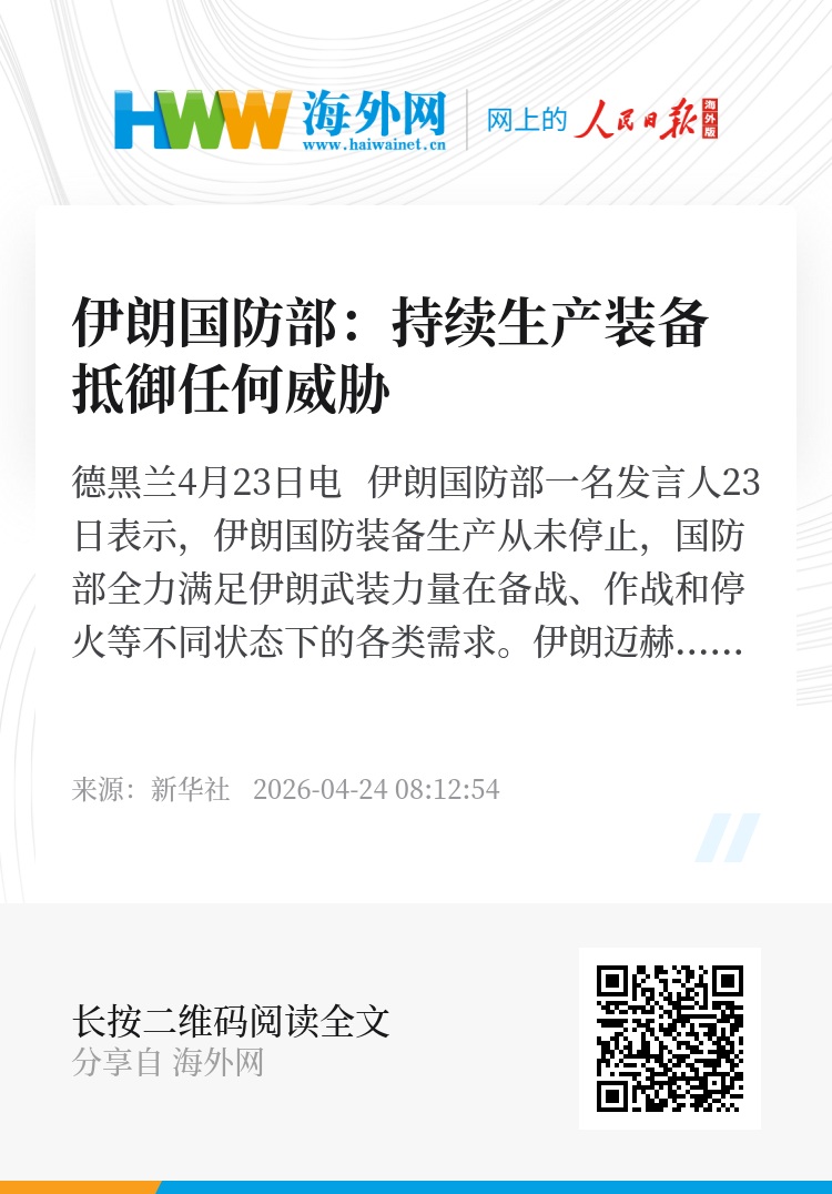 新华社德黑兰4月23日电 伊朗国防部一名发言人23日表示,伊朗国防装备生产从未停止,国防部全力满足伊朗武装力量在备战、作战和停火等不同状态下的各类需求。