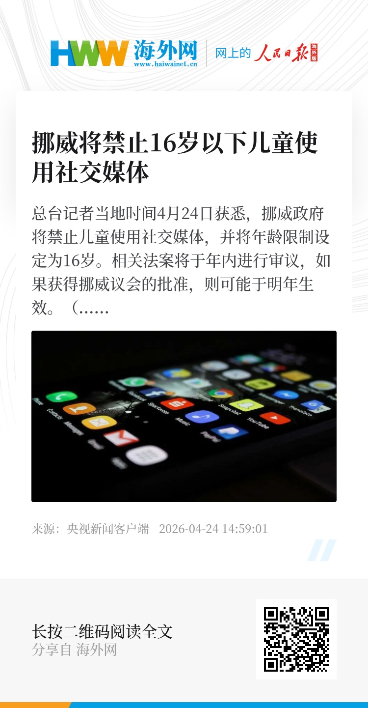 总台记者当地时间4月24日获悉,挪威政府将禁止儿童使用社交媒体,并将年龄限制设定为16岁。相关法案将于年内进行审议,如果获得挪威议会的批准,则可能于明年生效。(总台记者 郝晓丽)