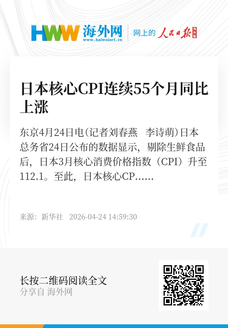 新华社东京4月24日电(记者刘春燕 李诗萌)日本总务省24日公布的数据显示,剔除生鲜食品后,日本3月核心消费价格指数(CPI)升至112.1。至此,日本核心CPI已连续55个月同比上涨。