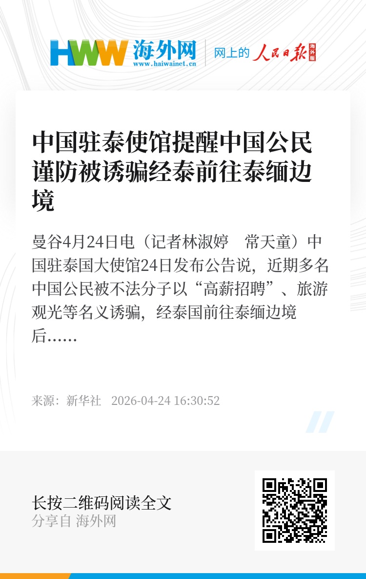 新华社曼谷4月24日电(记者林淑婷 常天童)中国驻泰国大使馆24日发布公告说,近期多名中国公民被不法分子以“高薪招聘”、旅游观光等名义诱骗,经泰国前往泰缅边境后从事电信网络诈骗等违法犯罪活动,个别人员遭遇人身控制、暴力侵害和非法拘禁,严重危及生命安全和合法权益。使馆提醒来泰中国公民务必强化风险意识,加强安全防范,远离非法活动。